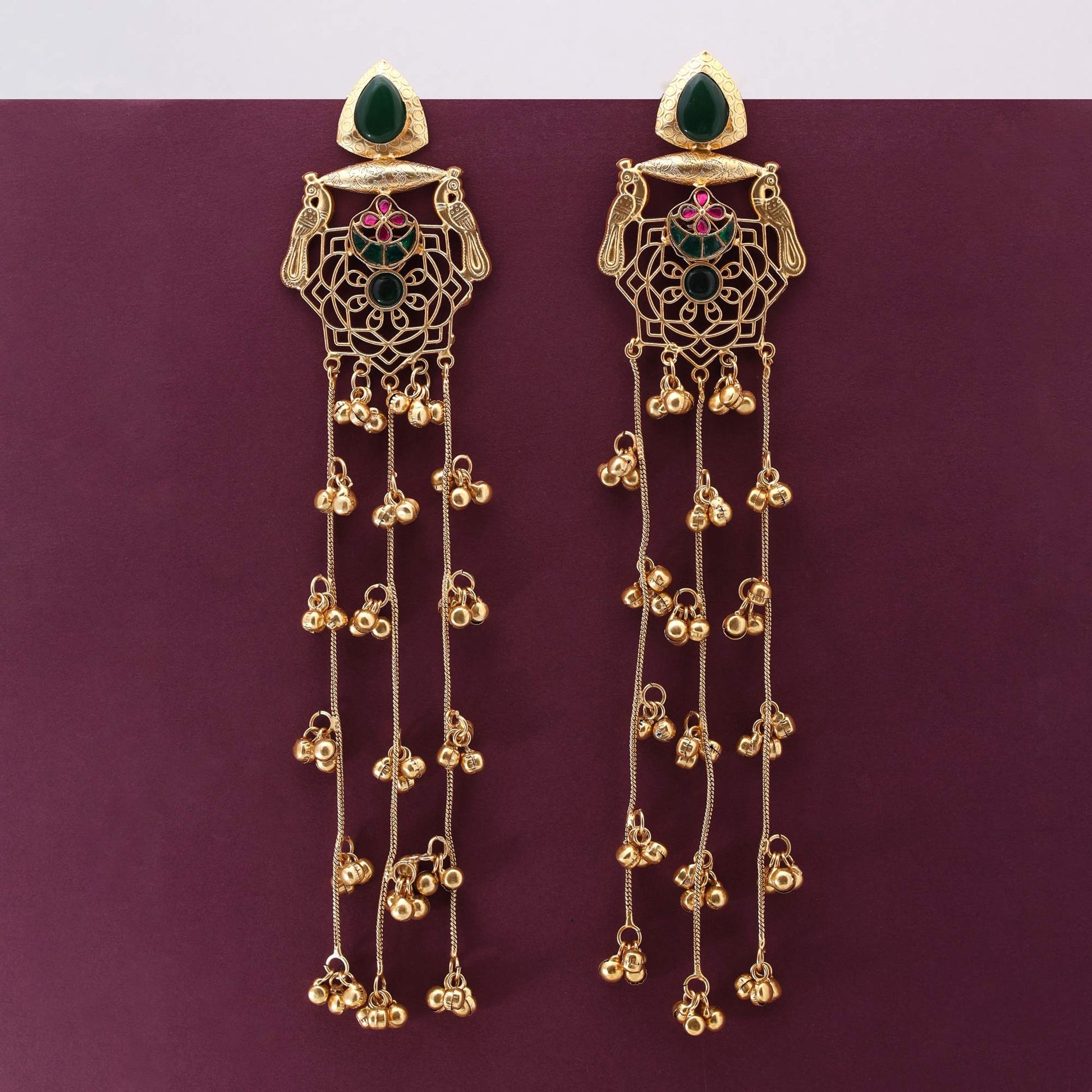 Green Color Royal Antique Finish Long Kashmiri Earrings For Elegant Dressing