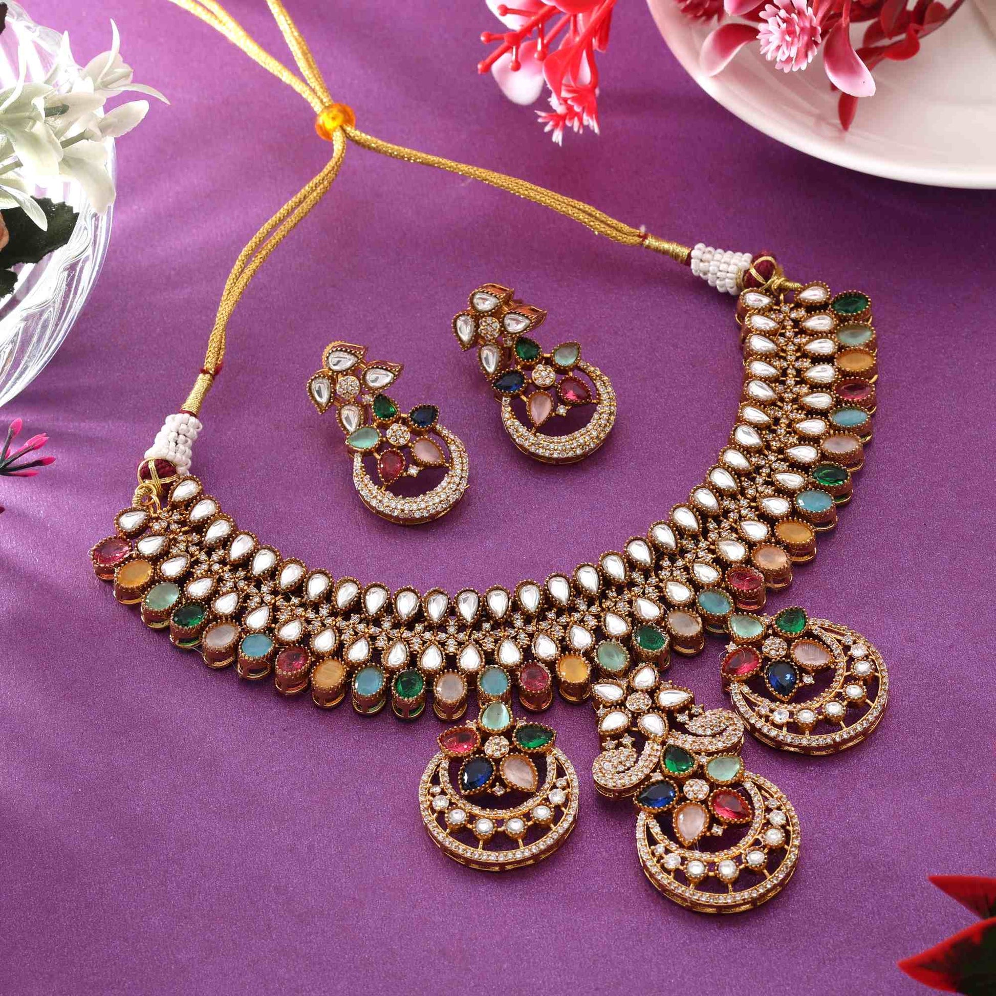 Multi Color Stone Work American Diamond Necklace Set For Stylish Festive Outfits