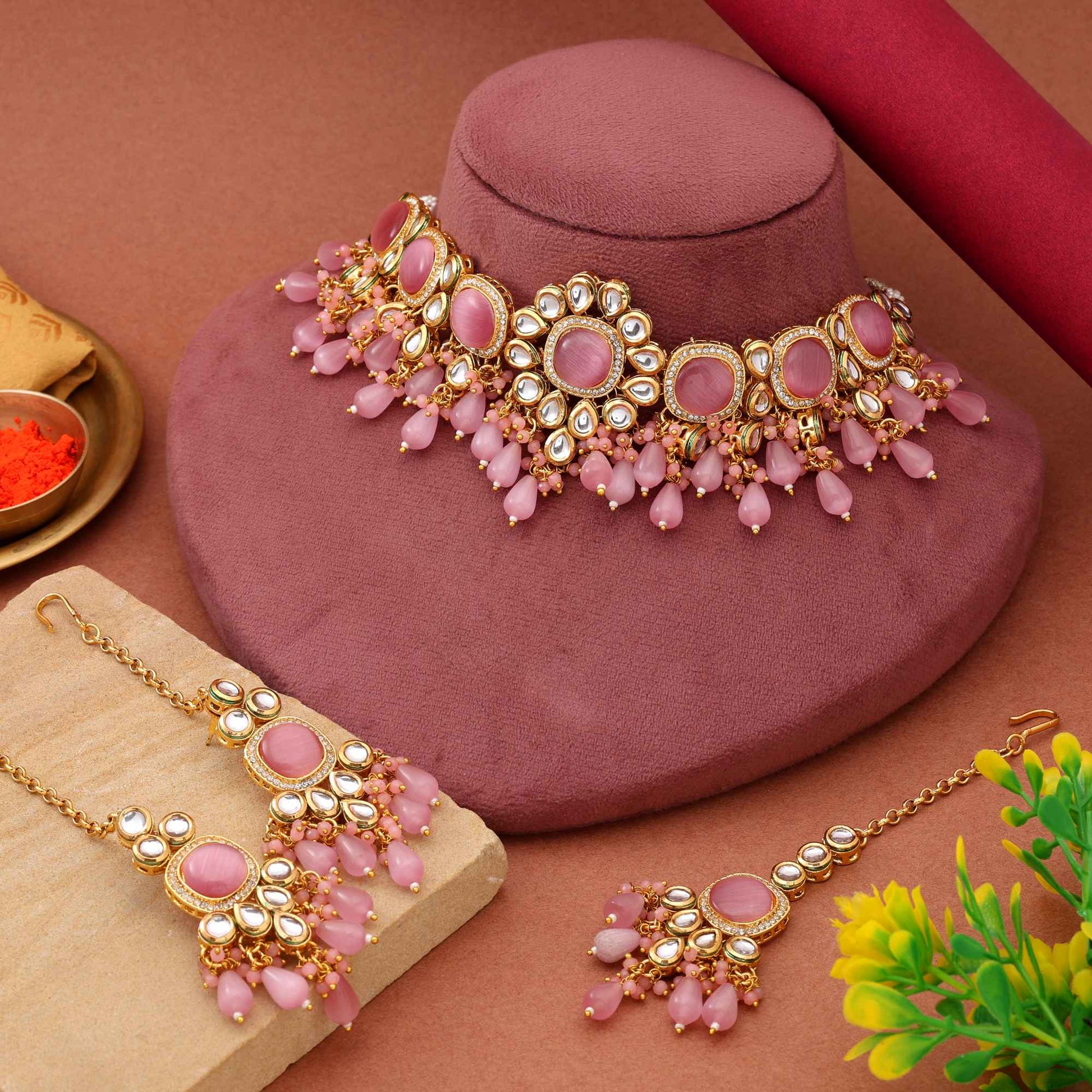 Pink Color Choker Style Bridal Back Side Meena Work Kundan Necklace Set For Elegant Look
