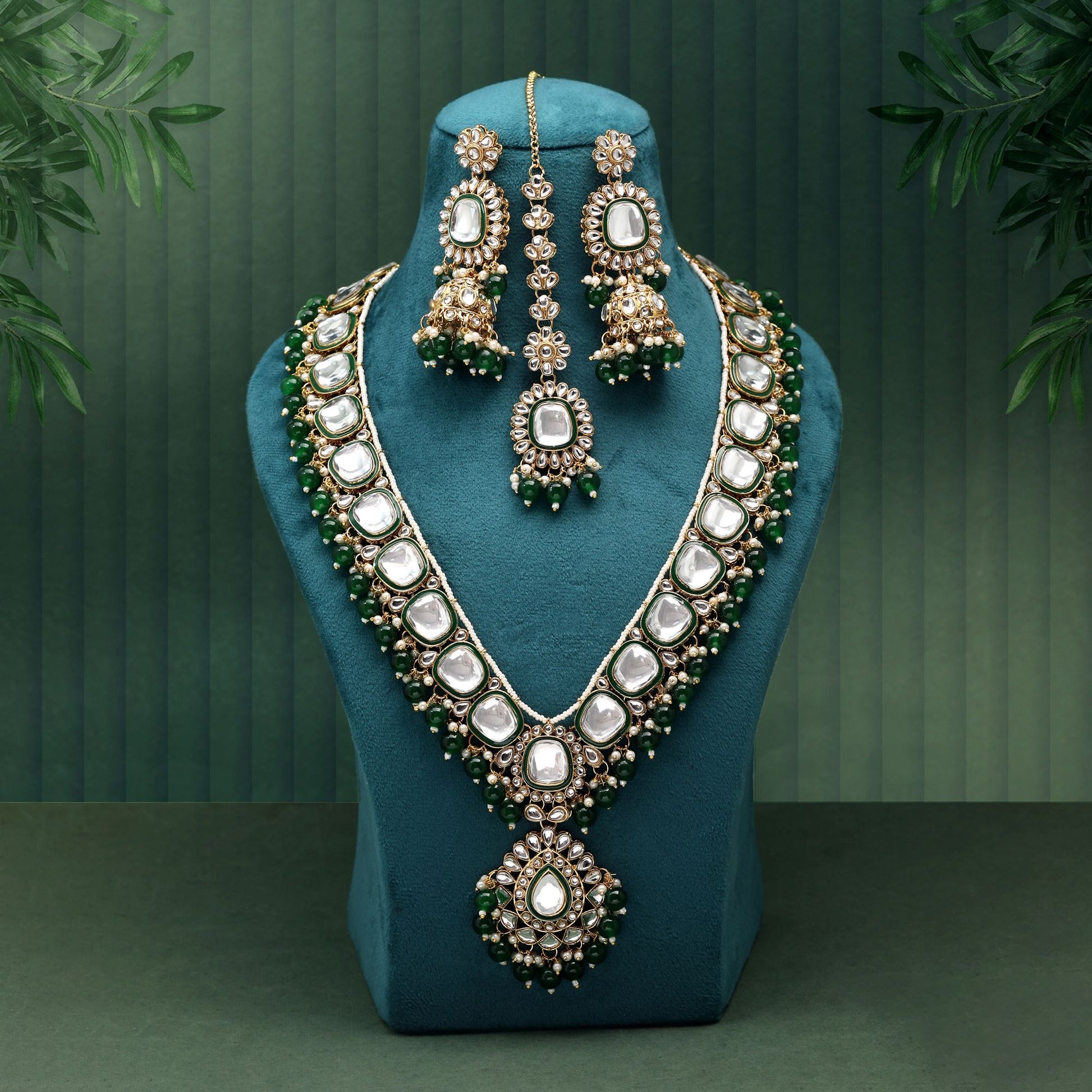Stylish Green Color Kundan Necklace Set Designed With Premium Detailing For Party And Festival Wear